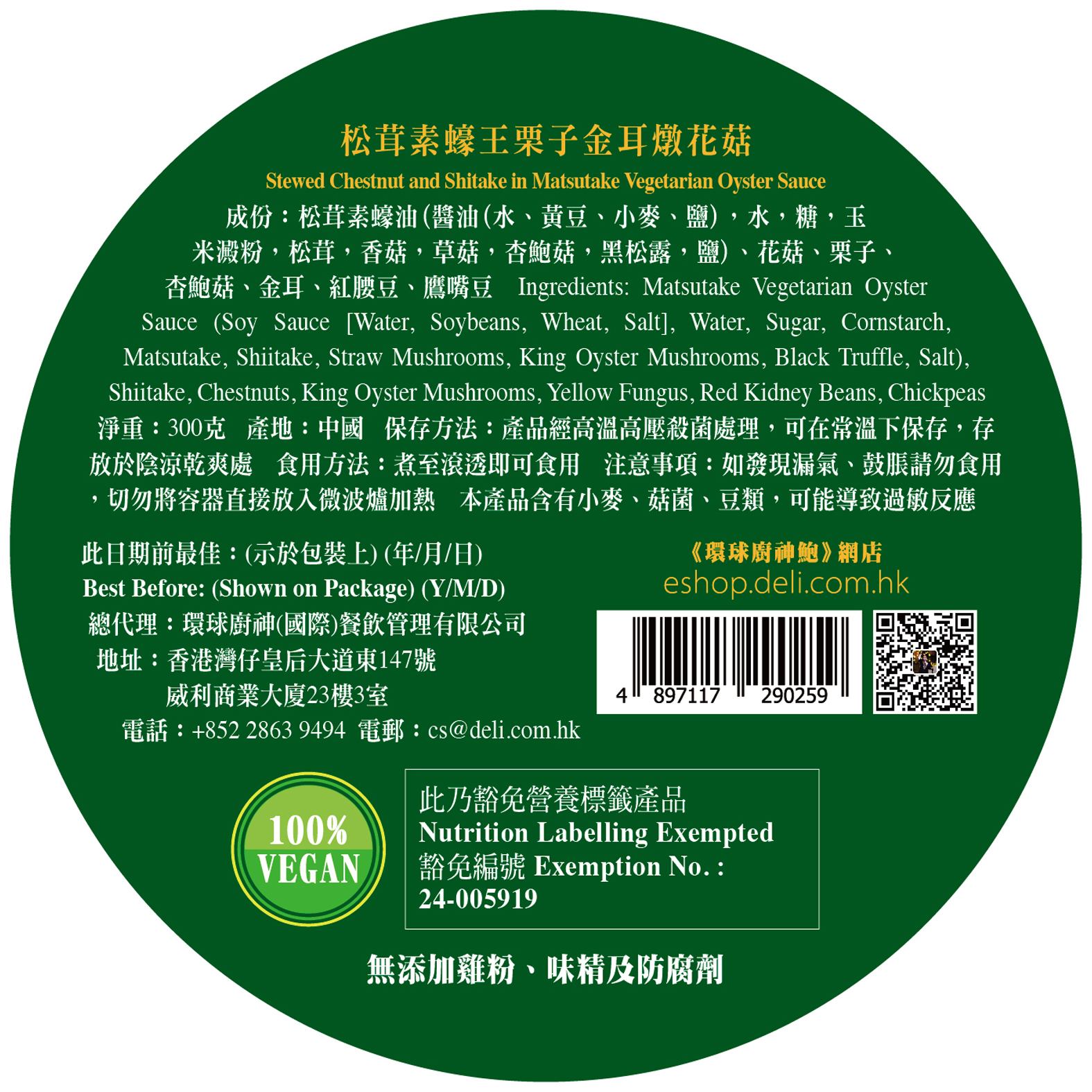 *純天然素食產品 *由米芝蓮周中師傅和「環球廚神」主席陳植漢攜手研發 *以松茸素蠔王為基礎,低溫熬煮4小時,減低營養流失,味道濃郁 *無添加雞粉、味精及防腐劑 成分:松茸素蠔油(釀造醬油(水、黃豆、小麥、鹽),水,糖,玉米澱粉,松茸,香菇,草菇,杏鮑菇,黑松露,鹽)、花菇、栗子、杏鮑菇、金耳、紅腰豆、鷹嘴豆 保存方法:產品經高溫高壓殺菌處理,可常溫保存,存放於陰涼乾爽處 食用方法:煮至滾透即可食用 注意事項: 1. 本產品含有小麥、菇菌、豆類,可能導致過敏反應 2. 生產此食品的廠房亦處理含有麩質的穀類、甲殼類動物、肉類、蛋類、花生、大豆、奶類、木本堅果及其製品 *產品詳情請參閱包裝上說明 *Pure natural vegan products *Crafted by the collaboration of Michelin-starred Chef Chow Chung and Chairman Louis Chan of Gourmet Master Chefs *Based on Matsutake vegan oyster sauce, sous vide for 4 hours to minimize nutrient loss while enhancing its rich flavor *No Chicken Bouillon, MSG and Preservatives added Ingredients: Matsutake Vegetarian Oyster Sauce (Soy Sauce [Water, Soybeans, Wheat, Salt], Water, Sugar, Cornstarch, Matsutake, Shiitake, Straw Mushrooms, King Oyster Mushrooms, Black Truffle, Salt), Shiitake, Chestnuts, King Oyster Mushrooms, Yellow Fungus, Red Kidney Beans, Chickpeas Storage: The product has undergone high-temperature and high-pressure sterilization and can be stored at room temperature in a cool and dry place Serving Instructions: Cook until boiled and ready to serve Cautions 1. This product contains wheat, mushrooms, and legumes, which may cause allergic reactions 2. The facility that produces this food also handles grains containing gluten, crustaceans, meat, eggs, peanuts, soy, dairy, tree nuts, and their products *For detailed product information, please refer to the instructions on the packaging